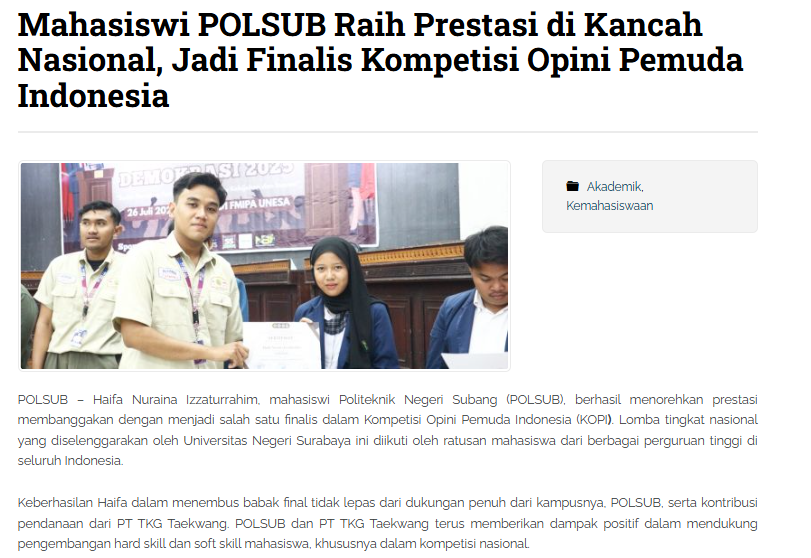 PT. TKG Taekwang menyalurkan donasi ke Politeknik Negeri Subang untuk keberangkatan Mahasiswa dalam lomba Finalis Kompetisi Opini Pemuda Indonesia di Surabaya. Lomba yang diikuti oleh Ratusan kampus di Indonesia ini diselenggarakan di Universitas Negeri Surabaya. Donasi ini merupakan bentuk kongkrit kepedulian PT. TKG Taekwang Indonesia untuk pengembangan mahasiswa dan mahasiswi di Kabupaten Subang tempat perusahaan berdomisili.